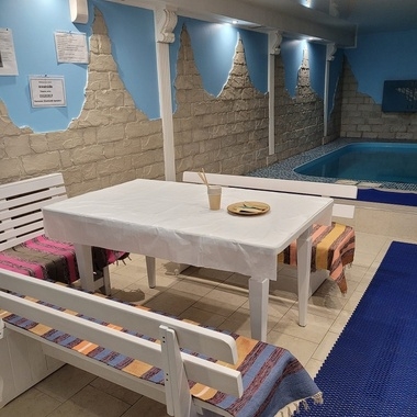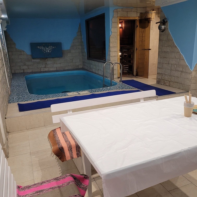 1. Кристально чистый бассейн(4*3 метра, глубина 1,5 метра) с современной системой фильтрации, светотерапией и гейзером. 2. Пол с функцией подогрева 3. ТВ + колонки 4. Белые скамейки из экоматерала, из осины 5. Стол обеденный 6. Комната отдыха 7.Парная с гималайской солью, благотворно влияющая на устранение аллергических процессов в организме. 8. Душ 9. Обливное с холодной водой 10. Запарник для веника 11. Вместимость – 6 человек, с доплатой до 15 человек. 12. Кулер 13. wi-fi